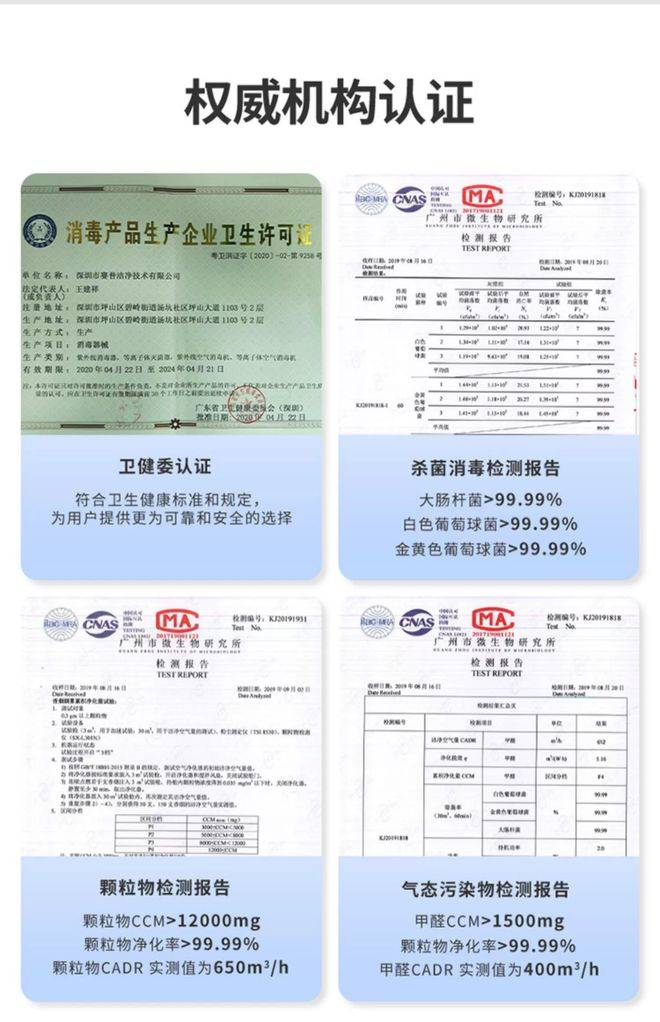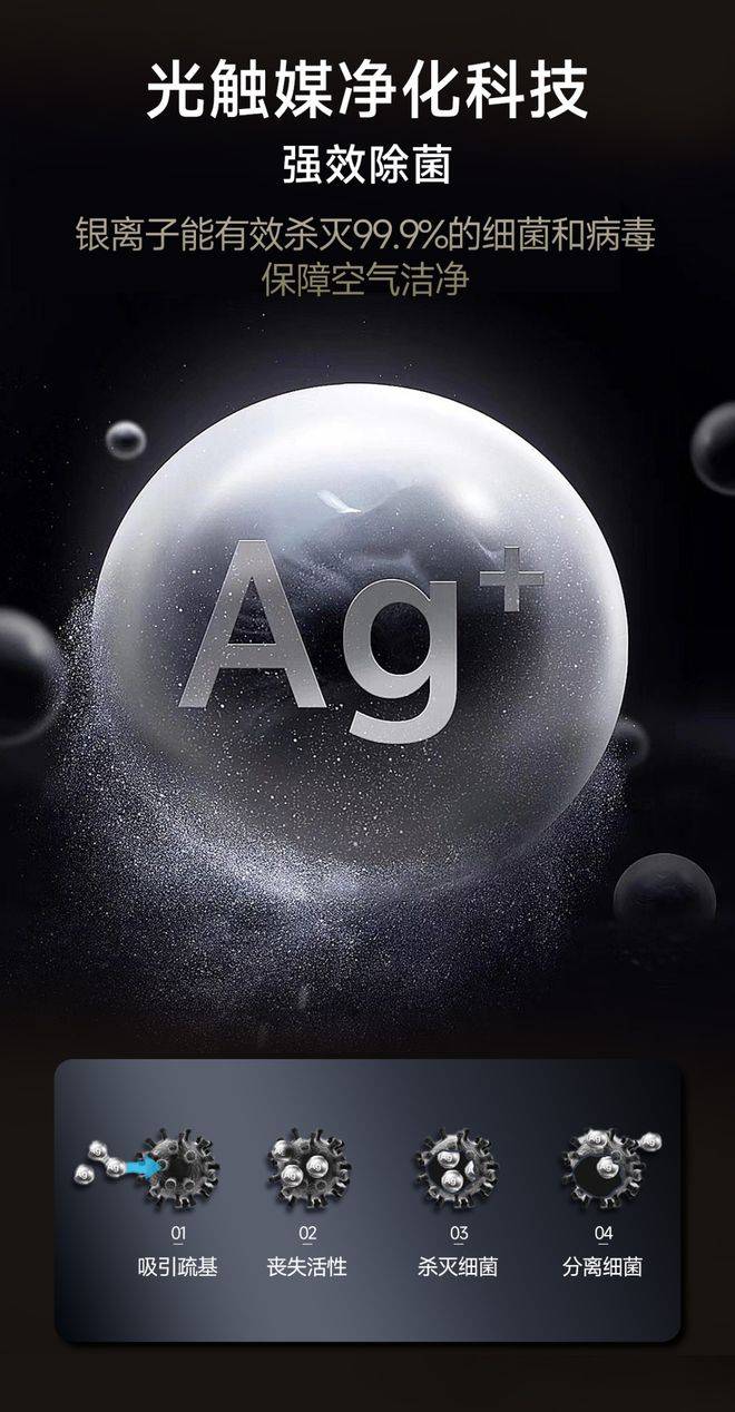 超强杀菌消毒技术:采用银离子+UVC 杀菌灯+光触媒三大机制共同作用,灭杀病菌,病毒去除率高达99.99%。污染物通过九层滤网重重把关,高效快速除醛灭菌,强效保卫呼吸健康。