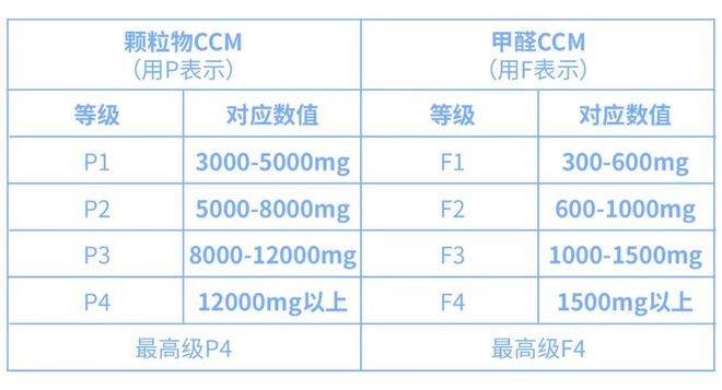 CCM表示洁净空气输出率,同样分为颗粒物和甲醛两类,颗粒物从低到高分为P1-P4四大等级,最高等级为P4。等级越高代表滤网的累积净化能力越强,简单来说也就是滤网的使用寿命越久,后期的耗材成本也就越低。