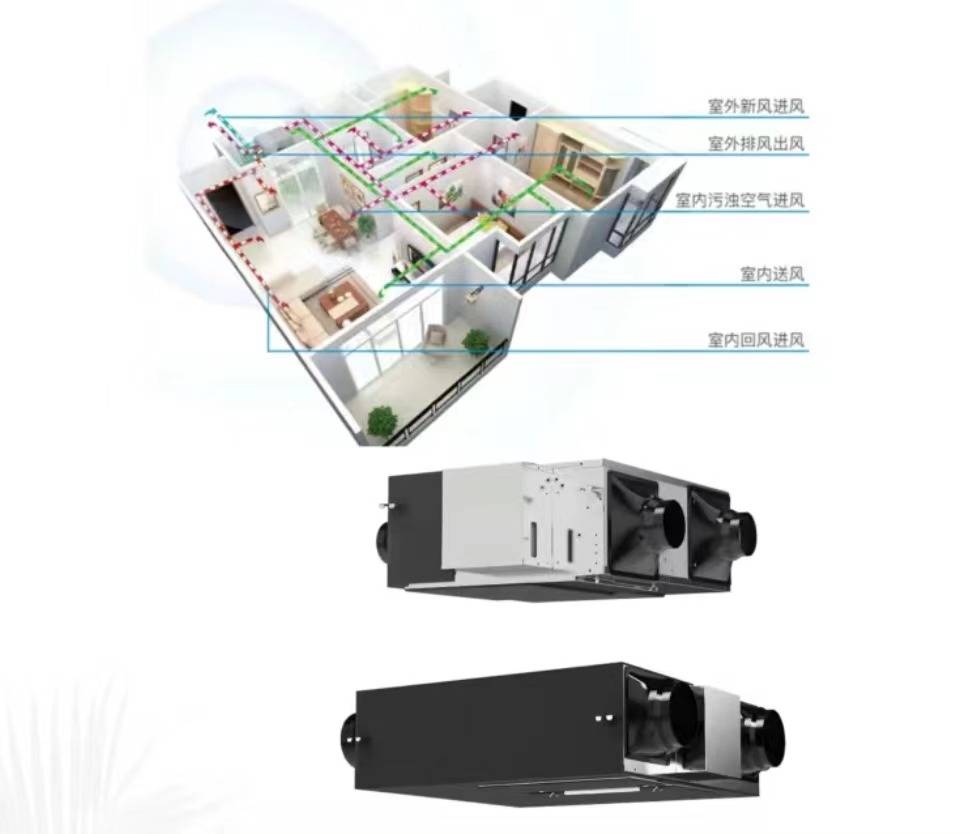 主要由进风口、出风口、风机、滤网和管道等部件组成。风机运转驱动空气流动,室外空气在压力差的作用下进入系统,经过滤网去除灰尘、花粉、雾霾颗粒以及部分细菌等杂质后,被输送到室内各个房间,而室内的废气则通过专门的排气通道排出。