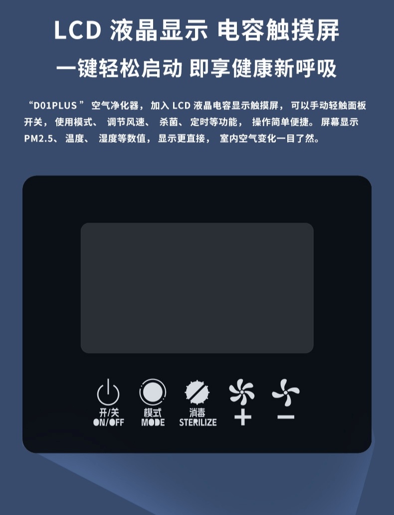 新增 LCD 液晶电容显示触摸屏,可手动轻触面板开关,实现使用模式、调节风速、杀菌、定时等功能,操作简单便捷。屏幕显示 PM2.5、温度、湿度等数值,室内空气变化一目了然。