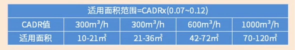 计算公式:适用面积=CADR值*(0.07-0.12)