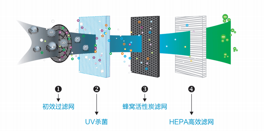 这意味着,它不仅能滤除粉尘、PM2.5、花粉等微小颗粒,也能滤除二手烟中的0.5μm的悬浮微粒。