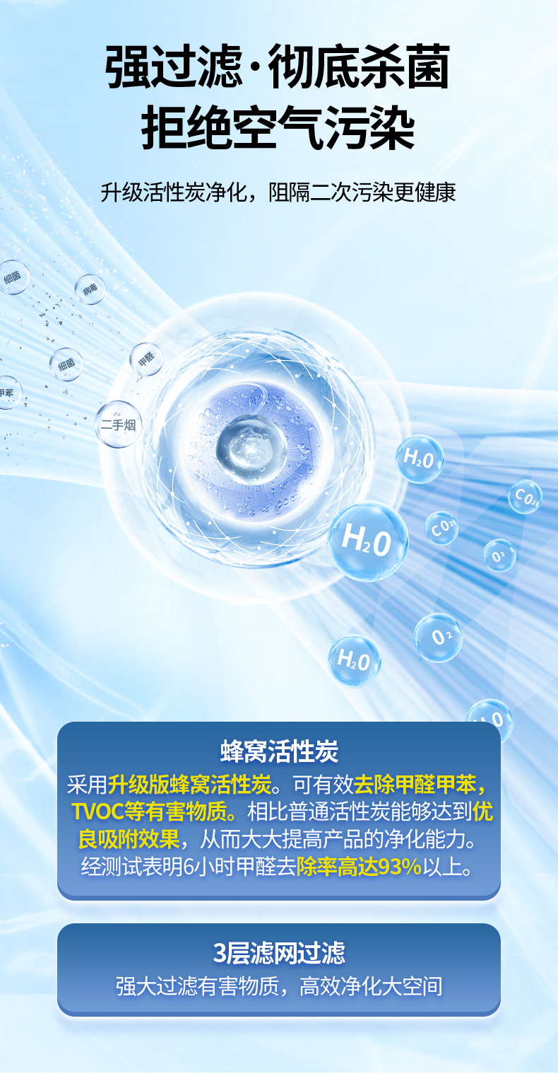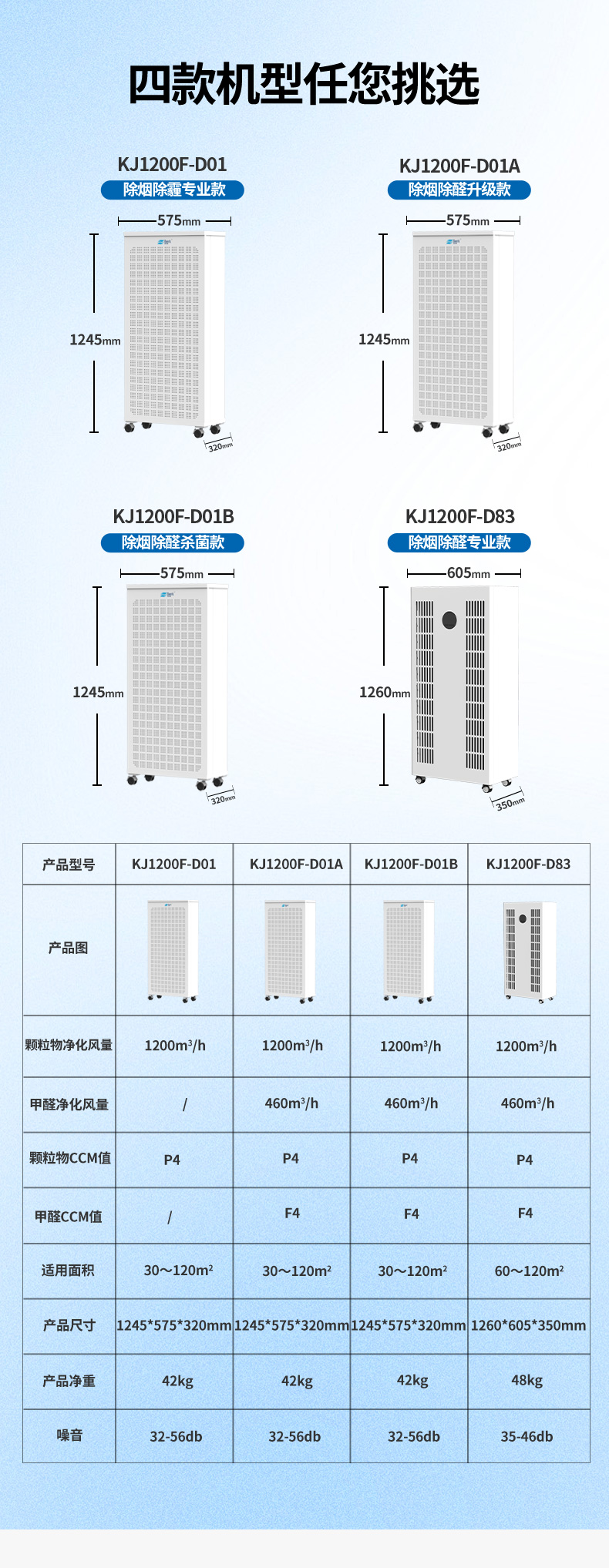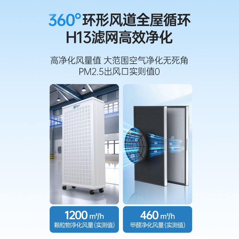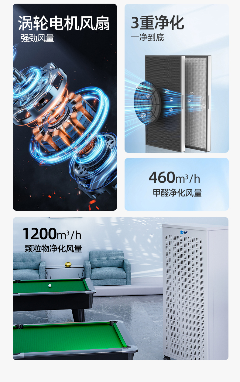 产品尺寸 1245*575*320mm产品颜色 智能白额定电压 AC220V运行功率 80~160W噪声 32--56dB颗粒物净化数值:1200m³/h甲醛净化数值:460m³/h颗粒物 CCM P4(>12000mg)甲醛 CCM F4(>1500mg)适用面积(㎡) 30~120 ㎡平方米产品净重 42KG