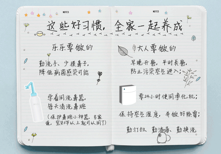北方的秋冬两季天气干燥,粉尘颗粒更容易携带病菌四处飘散。所以要从根源上减少病菌扩散,尽力保持生活环境与空气的洁净。此外,还可以采取一些措施,保持孩子鼻腔的清洁与湿润。
