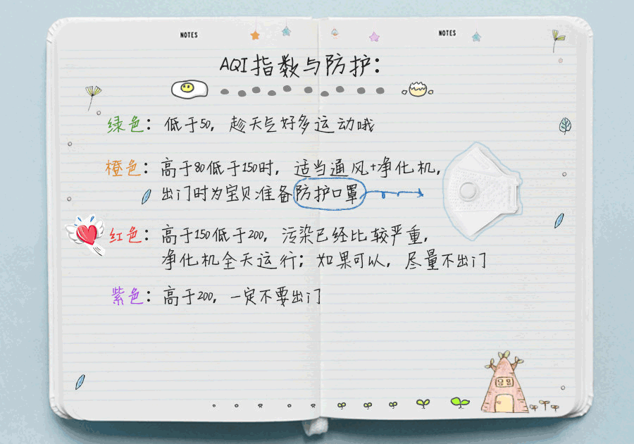 所以,除了常规的呼吸道防护措施,在污染季来临时,妈妈们还要做一些额外防护,比如除了 24 小时运行空气净化器,还要根据每天污染指数,及时调整防护措施。