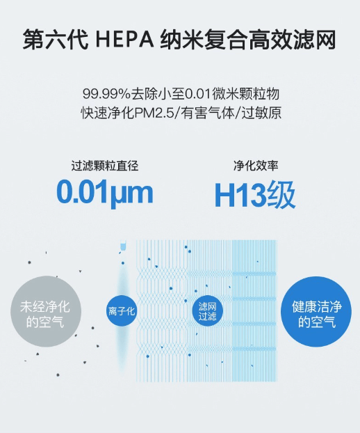 HEPA等级越高,过滤性越好,也能保证净化去除污染物的效率提高。因为HEPA 滤网本身对直径为 0.3 微米(头发直径的 1/200)以下的微粒去除效率可达到 99.97% 以上,所以是烟雾、灰尘以及细菌等污染物最有效的过滤媒介。