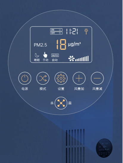 它配备 LCD 液晶触控显示屏,操作方便,搭配电容触摸屏一键启动。工业级高度精准感应器可时刻检测空气质量,如 PM2.5、甲醛等。在自动模式下,空气污染严重时会自动进入高速净化模式,能对 120㎡大面积空间无死角净化。