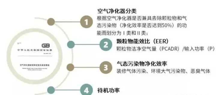 能效比是指空气净化器在额定状态下所提供的颗粒物洁净空气量与净化输入功率的比值。它依据去除固态污染物(颗粒物)和气态污染物(甲醛)的净化效率是否达到50%的功能而划分为I类和II类。