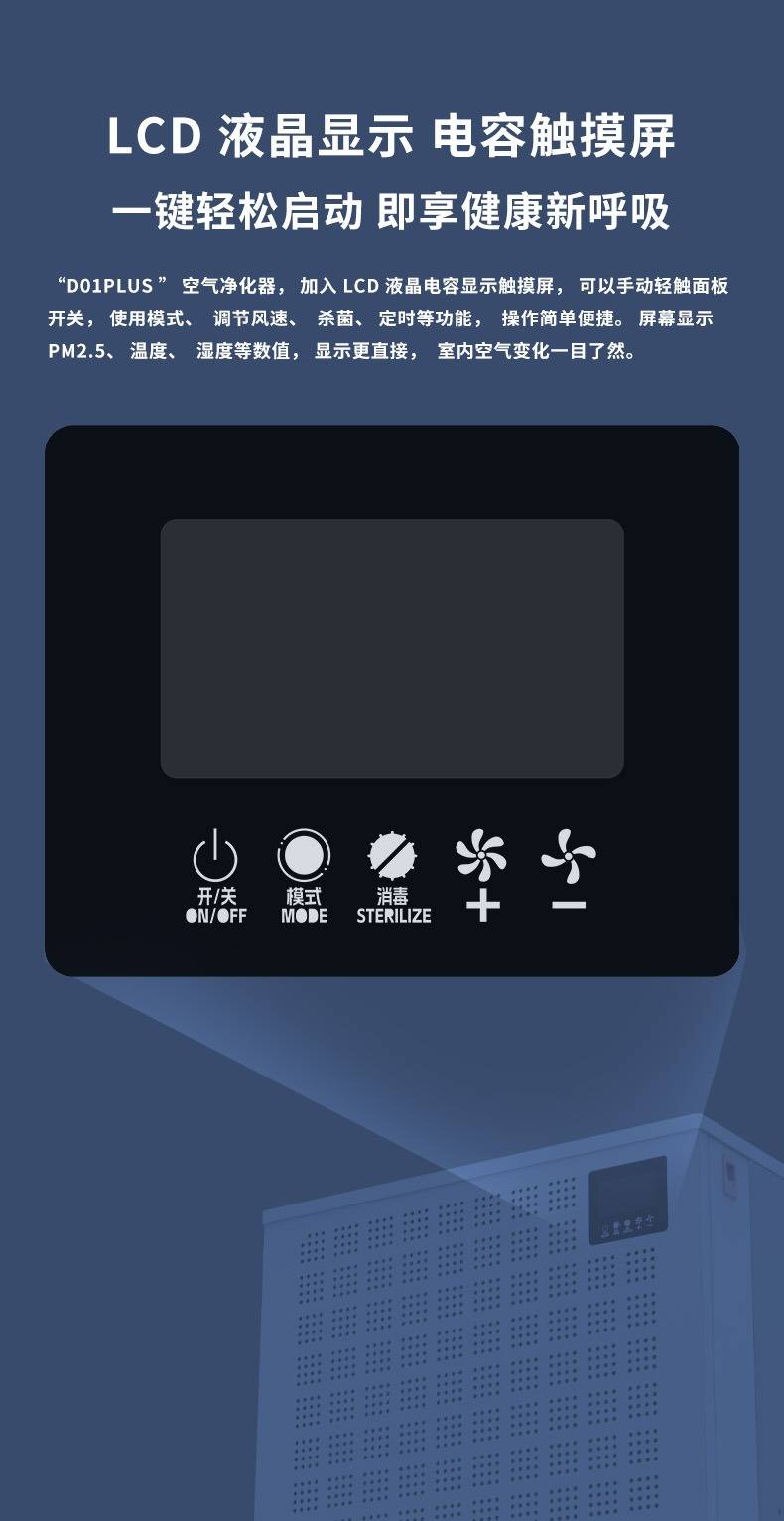 在智能功能上,还加入了LCD液晶电容显示触摸屏,可以手动轻触面板开关,使用模式、调节风速、杀菌、定时等功能,操作简单便捷。屏幕显示PM2.5、温度、湿度等数值,显示更直接,室内空气变化一目了然。